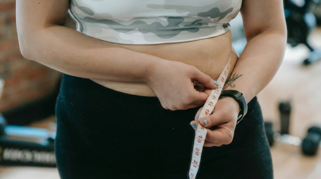 Woman measuring her waist with pink tape measure showing inch loss results from using CitrusBurn natural weight loss supplement for belly fat reduction